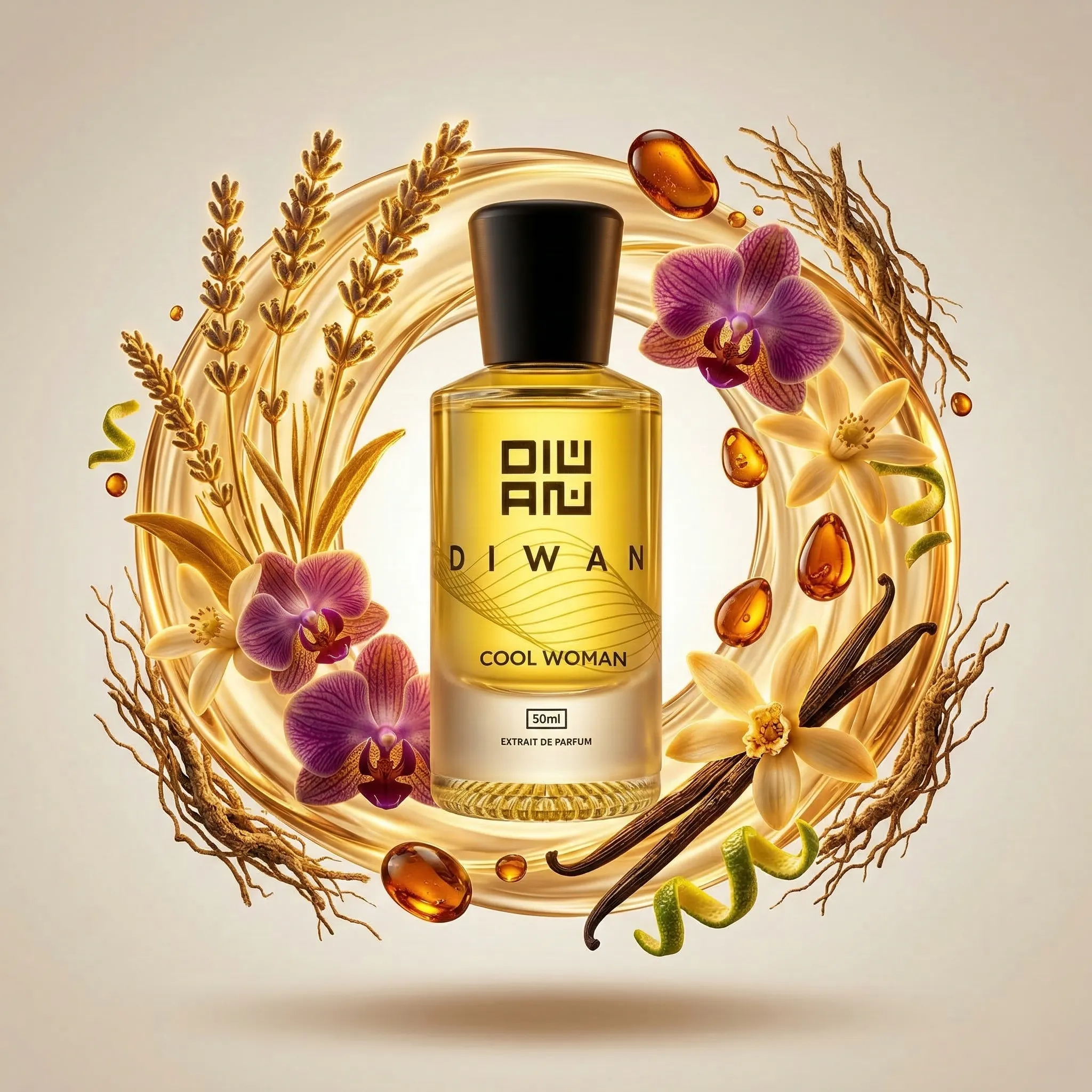 تفتتح الرائحة بمزيج متألق من اللافندر، اليوسفي والبرغموت، يتبعه قلب أنيق من الياسمين، زهر البرتقال والأوركيد، وتستقر القاعدة على عمق غني من فانيليا مدغشقر، التونكا والعنبر وخشب الأرز.