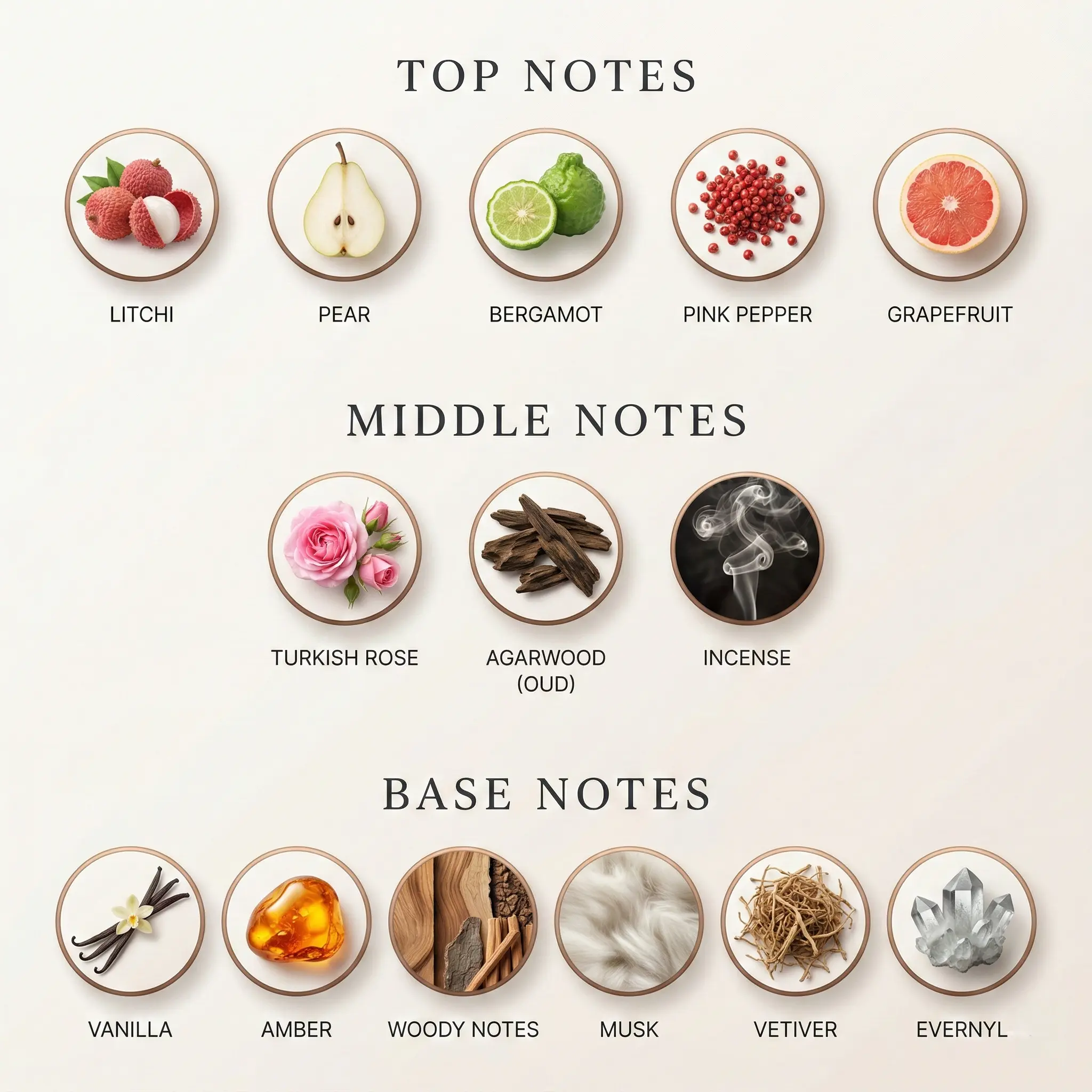 It opens with a luminous burst of Lychee, Pear, and Bergamot, flows into a rich heart of Turkish Rose, Incense, Oud, and Vetiver, and settles into a deep base of Vanilla, Amber, and Woods.