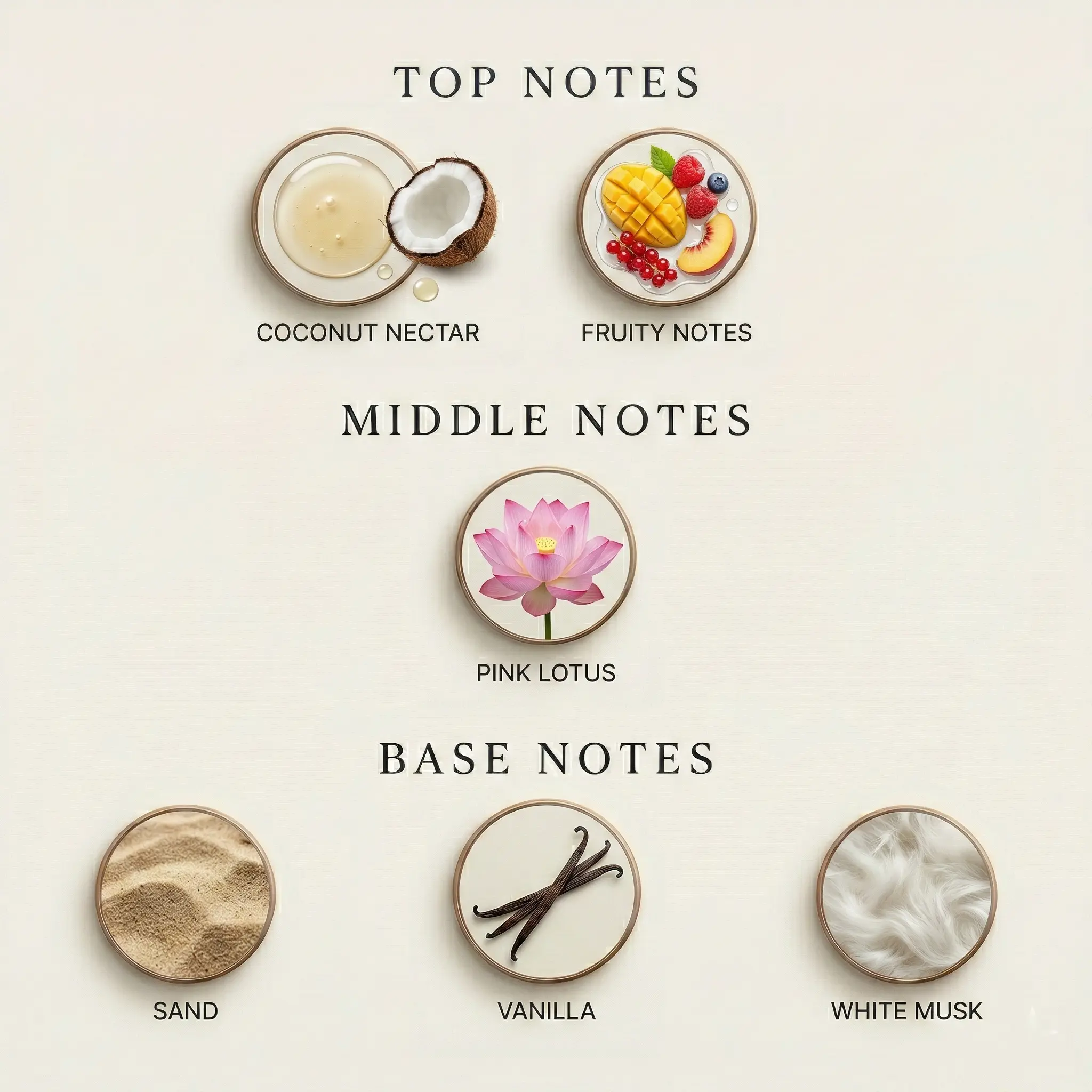 opening with Coconut Water and Star Apple, unfolding into a heart of Hibiscus, and settling into a soft base of Sandalwood and Musk.