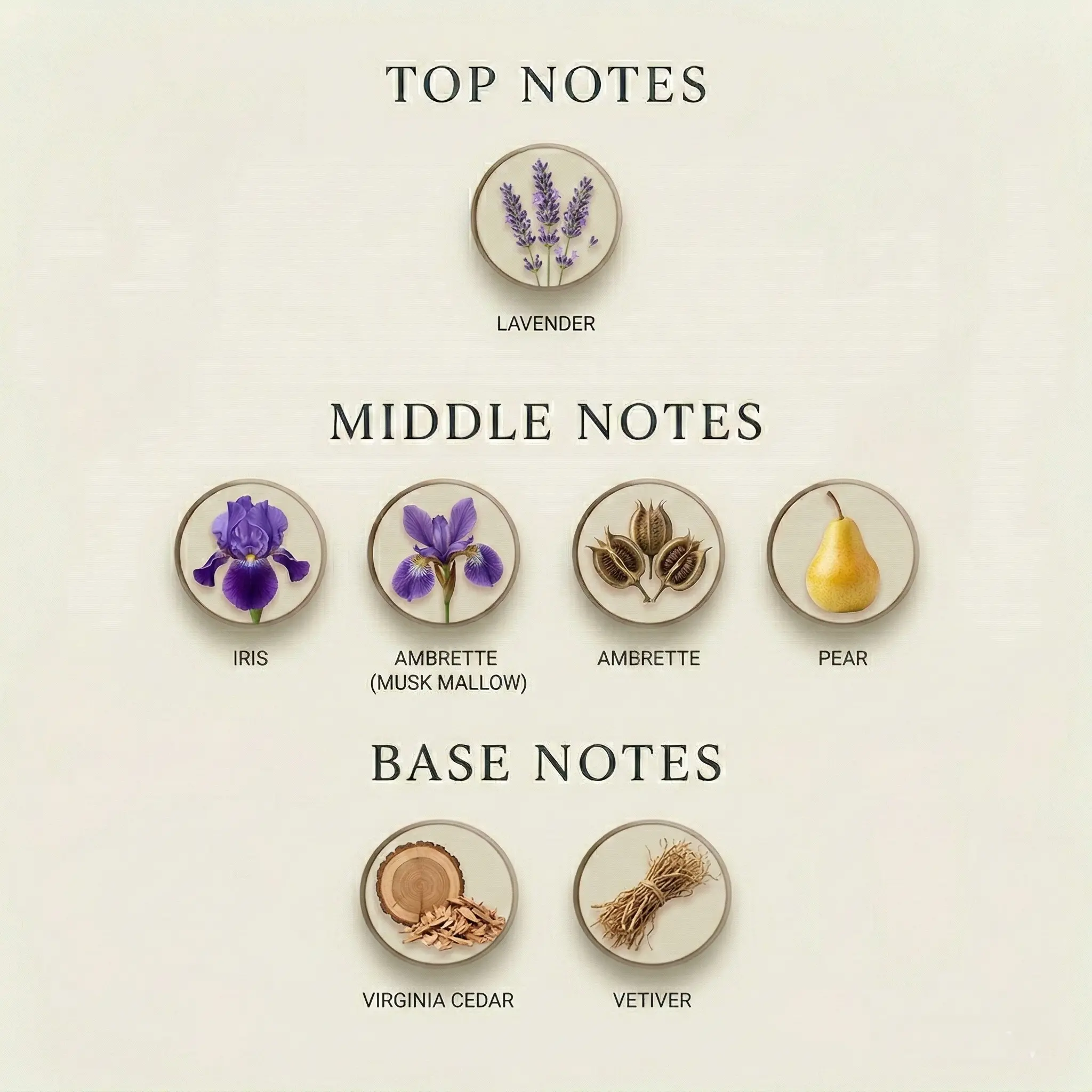 It opens with a soft touch of Lavender, flows into an elegant heart of Iris, Ambrette, and Pear, and settles into a refined base of Vetiver and Cedarwood.