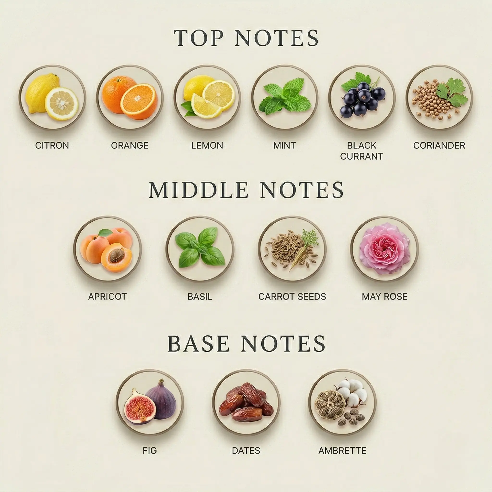 A fragrance inspired by Pacific Chill by Louis Vuitton, capturing pure freshness and natural vitality through a radiant “detox” sensation. It opens with luminous notes of Black Currant, Mint, and Orange, unfolds into a heart of May Rose, Basil, and Carrot Seeds, and settles into a soft base of Ambrette Seeds, Fig, and Dates. A scent that radiates freshness and serenity… a refreshing signature to remember.