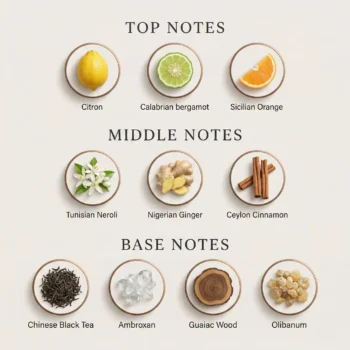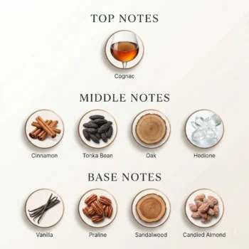 تبدأ الافتتاحية بنفحات من الزعفران والتوت، يتبعها قلب عطري كثيف من العود والبخور، وتستقر القاعدة على مزيج فاخر من العنبر، الجلد، والباتشولي.