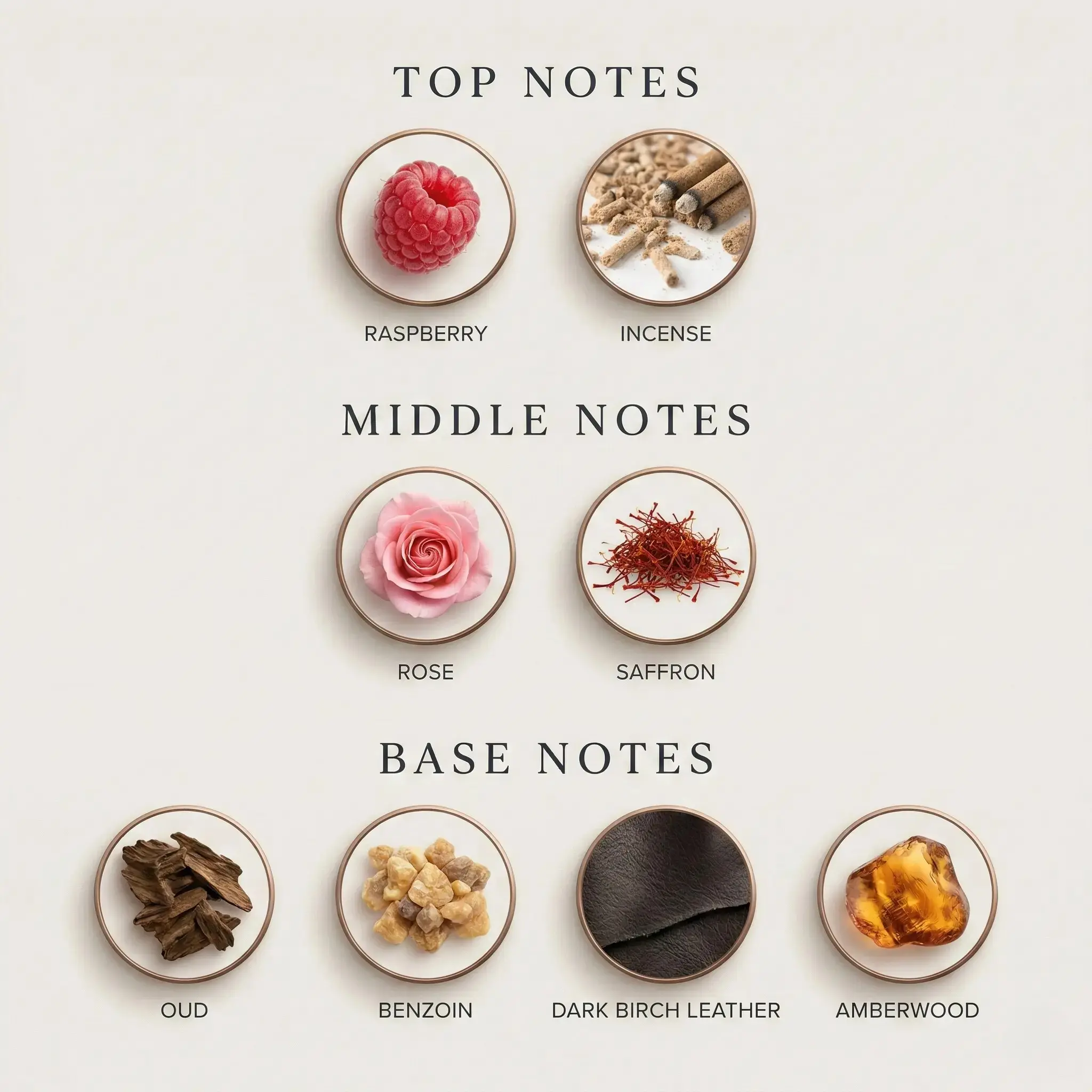 opening with Saffron and Raspberry, unfolding into a deep heart of Oud and Incense, and settling into a powerful base of Amber, Leather, and Patchouli.