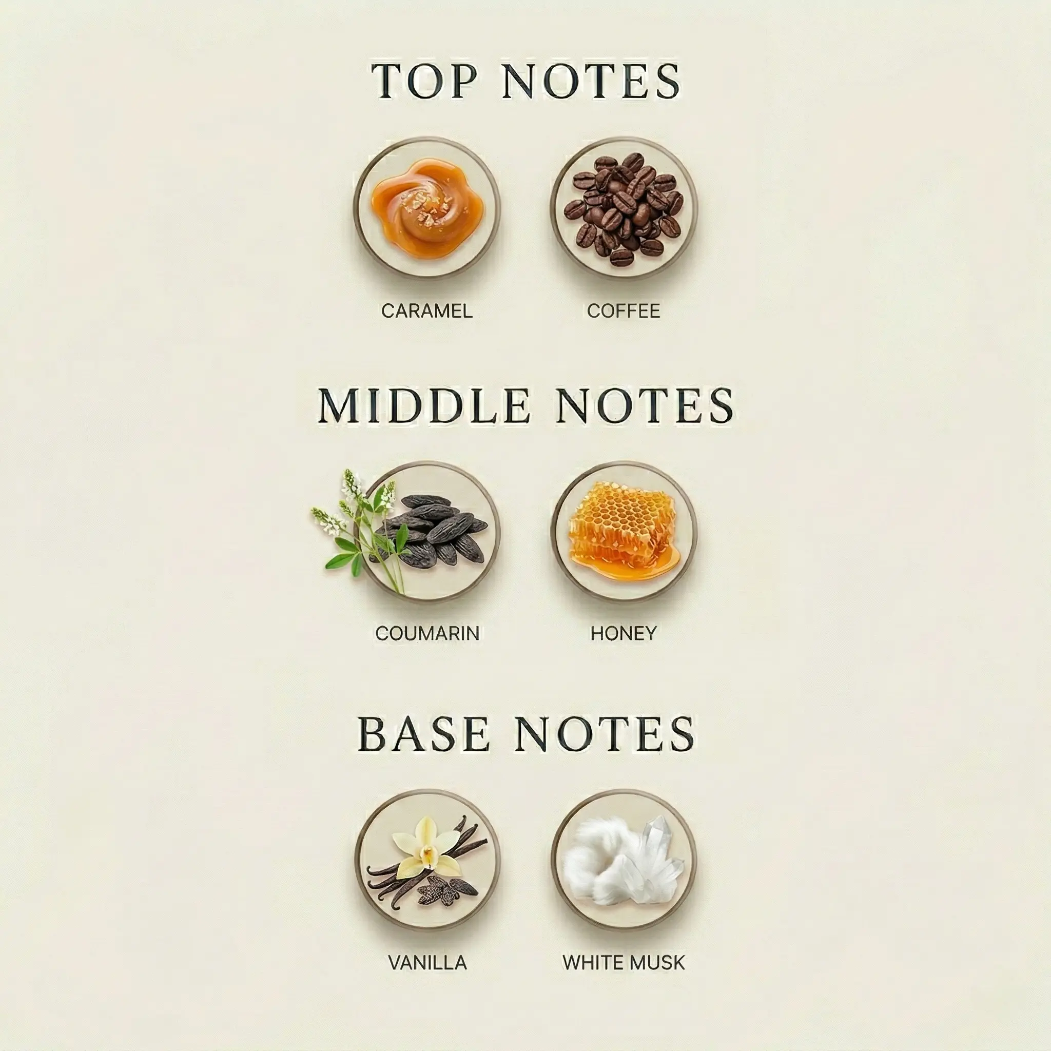 It opens with notes of Caramel, unfolds into a heart of Coumarin and Honey, and settles into a luxurious base of Vanilla and White Musk.